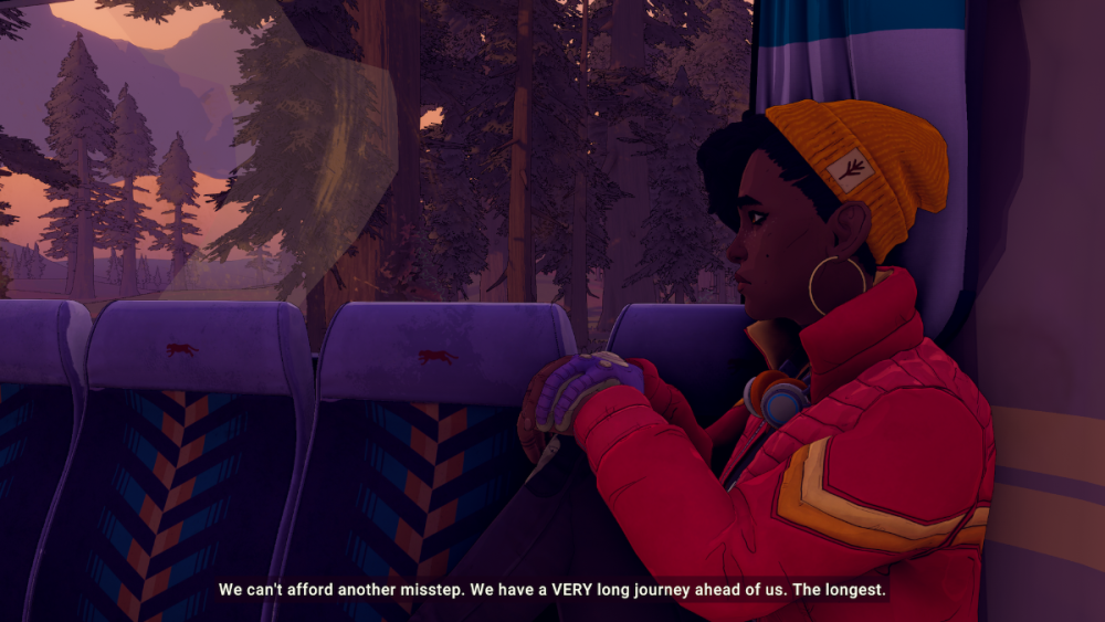 Guess I might as well, even if ultimately nobody else is going to play this. A bit of backstory, this is the third game from Red Thread Games, Ragnar Tørnquist's studio, which he founded to conclude his Dreamfall saga (with Chapters) roughly a decade ago. Their previous game, Draugen, is IMO an overlooked gem in the 'walking simulator' genre, easily on par with the likes of The Vanishing of Ethan Carter and What remains of Edith Finch, so I might as well use these lines to recommed it. Dustborn started development shortly after Draugen's release five years ago, so for a double-A title that's quite a bit of a ride. I remember posting its first screenshots in a forum that got closed down in 2020, which feels like an eternity ago and predates all the Sweet Baby backlash internet assholes have been throwing at it. It takes place in a near future in the USA, or rather the SA, because united they are no more after the assassination attempt on Kennedy failed and took his wife's life instead, turning him into a cynical and bitter person who proclaimed half of the country a police state and left the other half to do as they please. The game is build around the idea of a road trip and you and your fellow travellers ride a bus from the west to the east coast, looking for some sort of safe haven where they plan on selling some valuable cargo. Fundamentally this is some kind of Life is Strange esque narrative adventure, in which you run around blocked-off areas to explore a bit and talk to people. It doesn't have 'person X will remember this', nor are your choices black and white. There's also no morality bar or something like that. Instead, your choices affect which one of three main personality traits of your companions will end up being the most pronounced. So if I keep using the brutish Sai to knock down walls and afterwards compliment her for doing so, she will slowly turn into a 'punch first, ask questions later' type. It's not a high-level examination of psychology, but an interesting take on this whole morality aspect I think. What it doesn't do well is the mise-en-scène of all these dialogues, because frankly there isn't any. It's people either standing or sitting around, looking at each other and talking, while you can spin the camera around a bit. This is most likely a budgetary constraint but it does drag it down - maybe it's a personal preference, but even very static over-shoulder dialogue sequence à la Dragon Age Origins would have been better than what they used here. Unfortunately the writing can be very hit and miss as well. There's one moment where you have to cleanse Echoes from people, which are remnants of misinformation-spreading propaganda thought bubbles influencing people in their line of thinking. At some point I noticed this must be some commentary on social media and then, not two minutes later, one of the characters just literally spelled it out. But there are some good moments as well and your crew, while not particularly likeable, is at least an interesting bunch. Oddly for a game in this style, Dustborn also has combat segments. It's super clunky and unpolished, but I can't deny that it can be some fun and is a nice diversion, especially as it amounts to, at best, 5 minutes every hour of playtime. There's basic attacks, dodges, parries, some special moves, team-up attacks. It's simple, but cute, though the lack of lock-on means you miss quite a few of your bat swings. Both in combat and during some dialogue scenes, you can also use the main character's Vox abilities, which is kind of this universe's X-gene and gives certain mutants Anomals special powers. In your case, that means controlling people with your voice, which can influence dialogue branches and, among other things, stop opponents in their tracks during combat. During the latter it's a pure gameplay system, but using it during dialogue sequences does have repercussions on your standing with teammates or how the story progresses. There's also a (surprisingly fun) rhythm minigame in there, as the cover under which the group travels is that of a band. And a sort-of ghost-hunting minigame (for the aforementioned Echoes) that unlocks new Vox powers. And maybe more, I don't know – I'm only about four hours in but the game just seems to throw random stuff at the wall in regular intervals. I've not fully formed an opinion on it yet. I think the first 90 minutes to two hours are almost excruciatingly boring as it just drops you into the narrative without much introduction (for that, you need to read a prologue comic from the main menu) in regards to what you've been doing prior to the title screen and why you should care. At a certain point it introduces a couple new characters from the protagonist's past, and then goes on a tangent with a bit of mystery stuff and I started enjoying it a lot more. Guess we'll see where it goes from here. On last note but I like the visual style. It's a clean, comic-style look somewhere between Borderlands and Sable, and chapters are introduced with fake comic book covers and such. Gives it a lot of personality the in-engine stuff not always manages to fully pull off in motion.