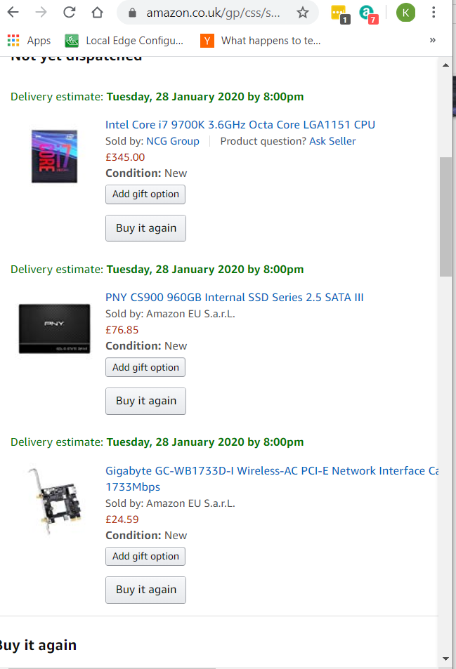 Popular Post one-armed dwarf Posted January 27, 2020 Popular Post Posted January 27, 2020 Working from home today to sign for all my OC deliveries, which all just arrived. So now it's just CPU, SSD and WiFi adapter from Amazon, which arrive tomorrow apparently. So will probably start building this thing today. Then if I get hungry later maybe there will be some haribos with my graphics card. Surprised by the speed of the delivery from UK to Ireland, think when I ordered before from OC and was actually in the UK it actually took longer. Edit, haribo confirmed. I shall want for nothing this month 6